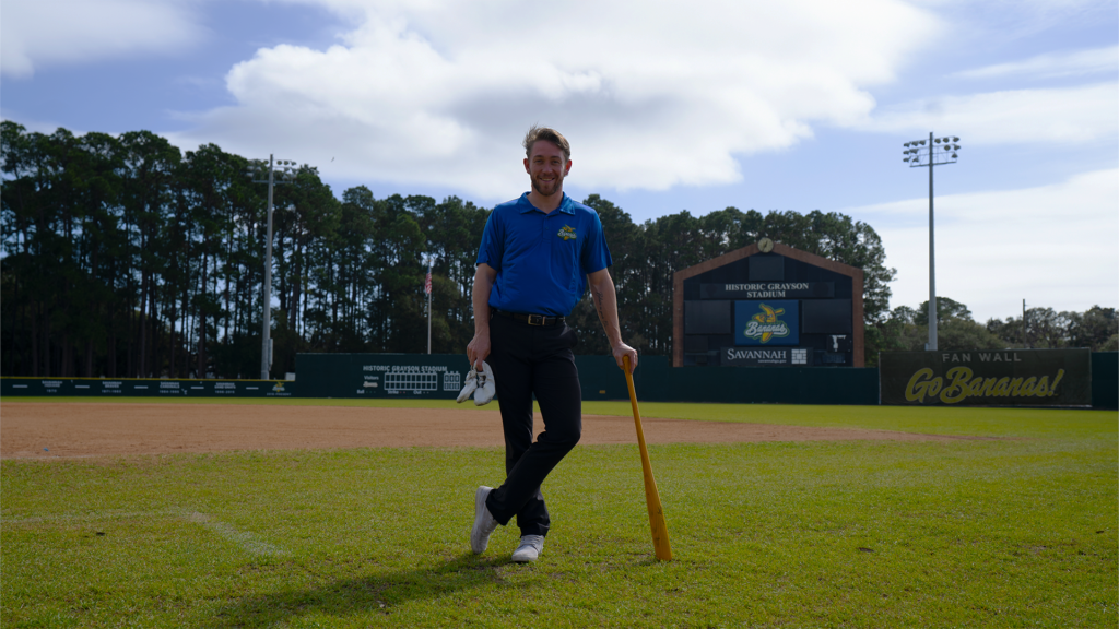 As the director of entertainment for the Bananas, Frongillo is responsible for ensuring crowds don’t just see a baseball game, but a variety show that includes everything from a 65-and-up line-dance squad (the Banana Nanas) to a batter walking up to the plate on stilts—and, yes, dancing first-base coaches, which has become something of a tradition for the team.